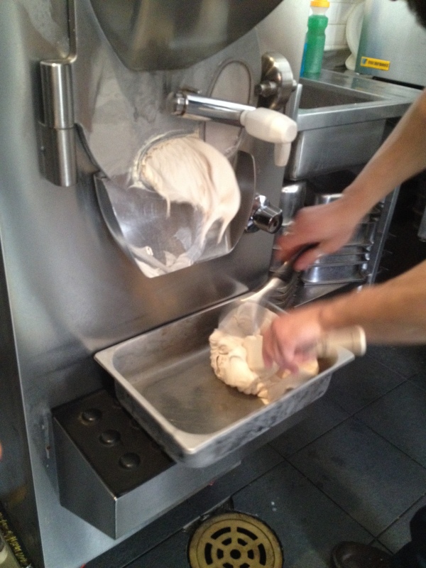 מנוזל לקפוא. מכינים אותו דבר כמו עוגה רק שבמקום להכניס לתנור מכניסים לקירור. יש שלב נוסף לפני ההוצאה אל מקרר התצוגה הוא להכניס למכונה שנותנת שוק של קור כדי לחזק את המעטפת החיצונית של הגלידה על מנת שלא "תיפול".