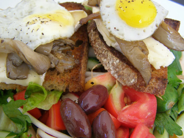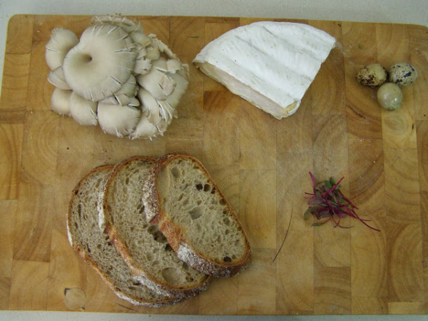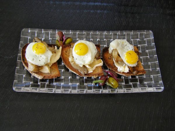 ברוסקטה של ביצת עין שליו, פיסת גבינת קממברט ופטריות יער מוקפצות